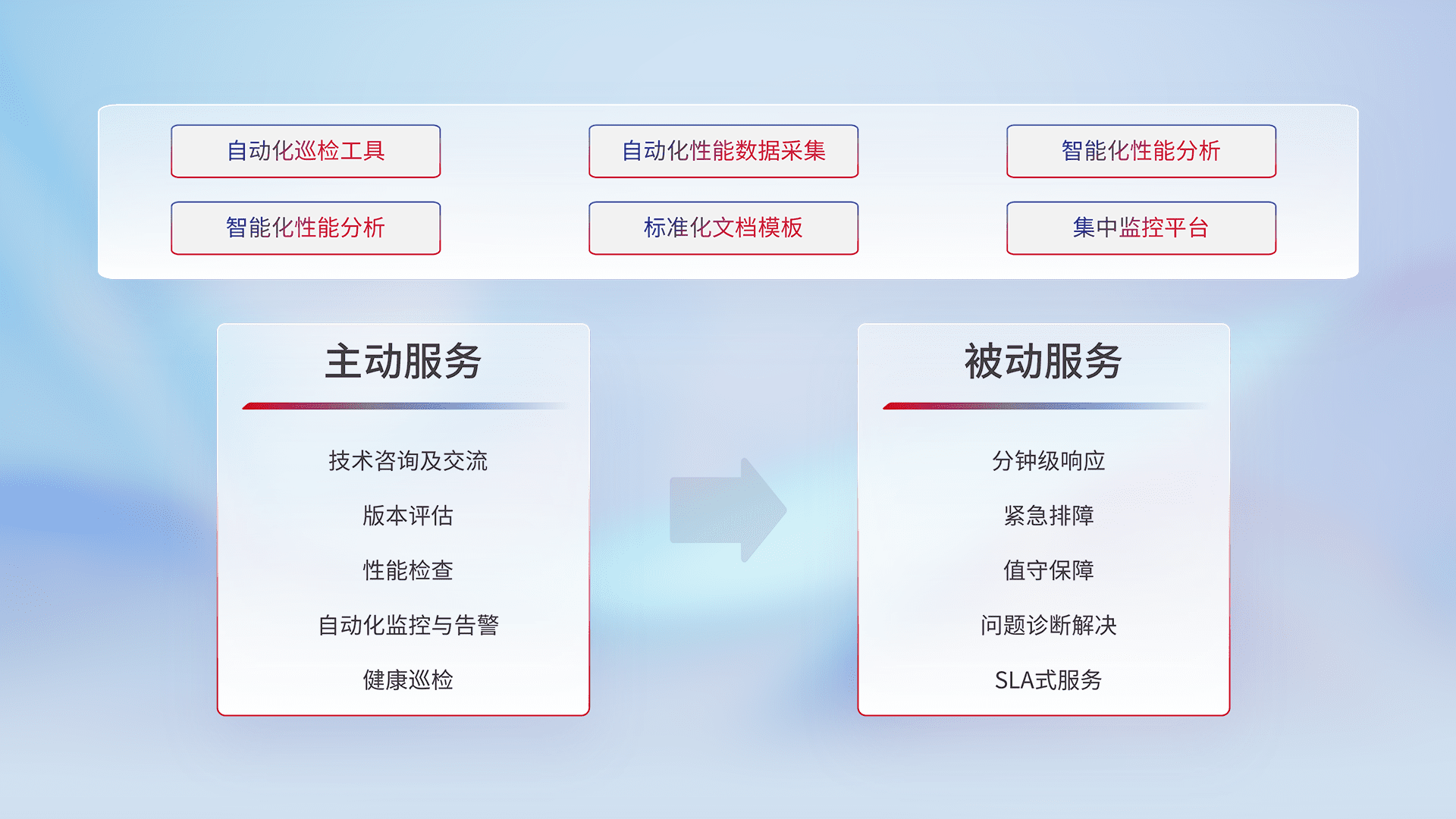 智能化工具和标准化文档,,保障服务质量,,,,提供主动服务(包含技术咨询、、版本评估、、性能检查、、、自动化监控与告警、、、健康巡检)和被动服务包含(分钟级响应、、紧急排障、、、值守保障、、、、问题诊断解决、、SLA服务)。。。